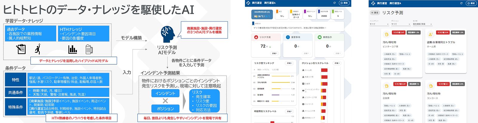 「AIは人の代わりになるモノ(HITO → AI)ではなく、人の力を拡張するモノ(HITO + AI)」という想いのもと開発。生成AIが現場の案内スタッフ・警備員に向け、日時や施設、イベントなどに応じて発生しやすいインシデントや予防策・対応方法を提示することで、現場の判断力と行動力を支え、効率的で安全・安心な運営管理を実現します。