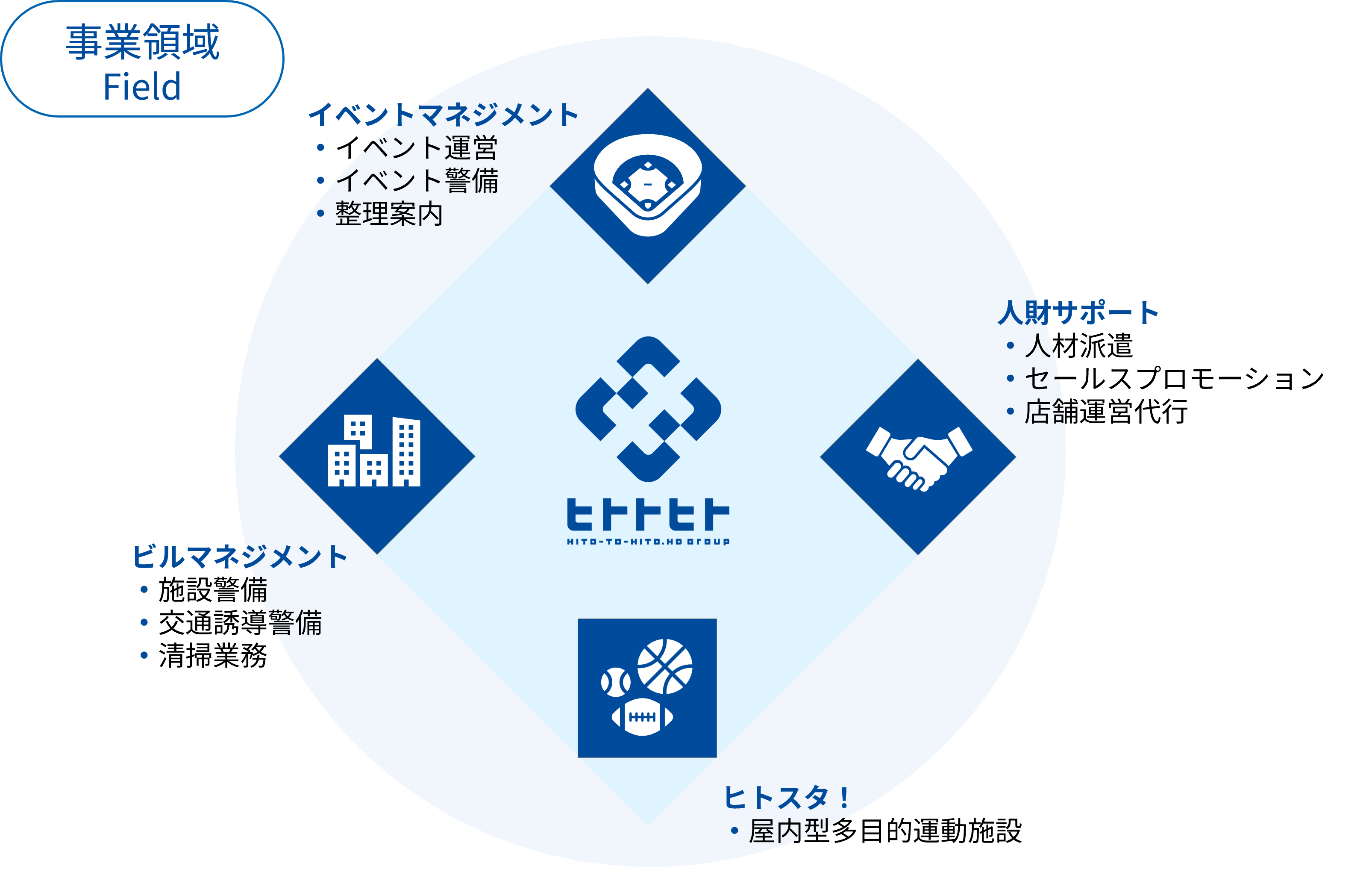 当社グループは、1974年の創業以来、一貫して「人の力」を軸に事業を展開しています。専門性の高いイベント運営管理や警備・清掃、人材派遣やセールスプロモーションなど、幅広いサービスを提供し、今後も業務分野と展開地域を拡大してまいります。