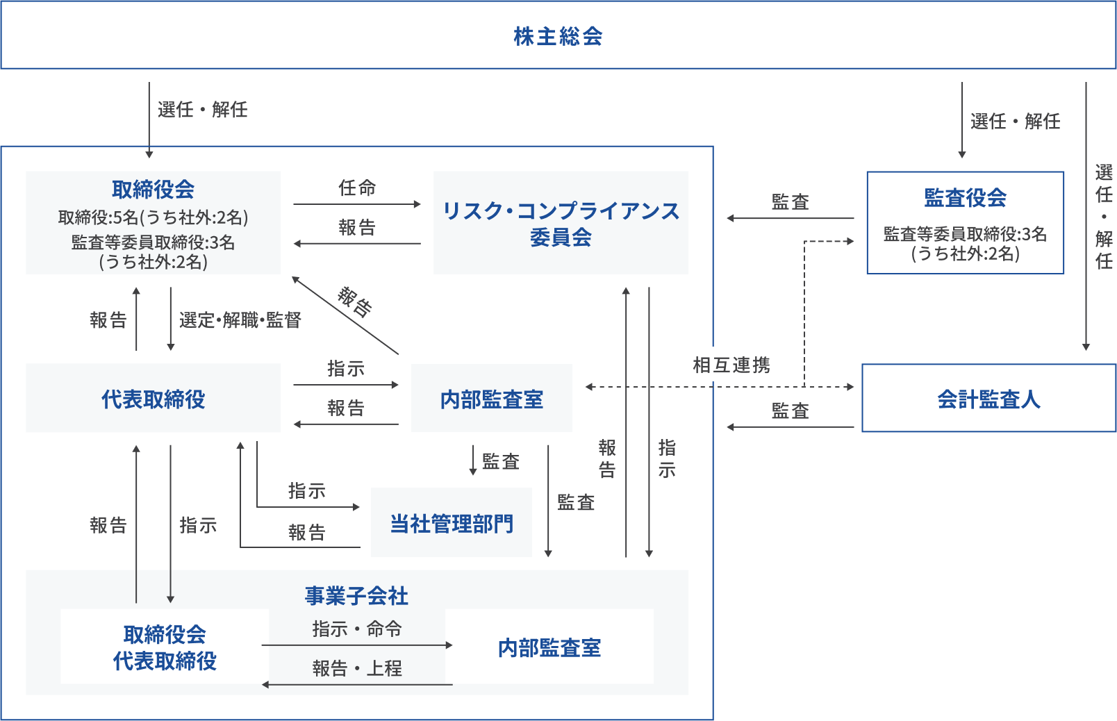 当社のコーポレート・ガバナンスに関する基本的な考え方は、迅速を旨としながらも効果とリスクについて十分に議論を尽くし、適法性・健全性を最優先に透明性の高い意思決定を行うというものであり、取締役会及び監査等委員会を中心に、コーポレート・ガバナンスの遵守と強化を図ってまいります。