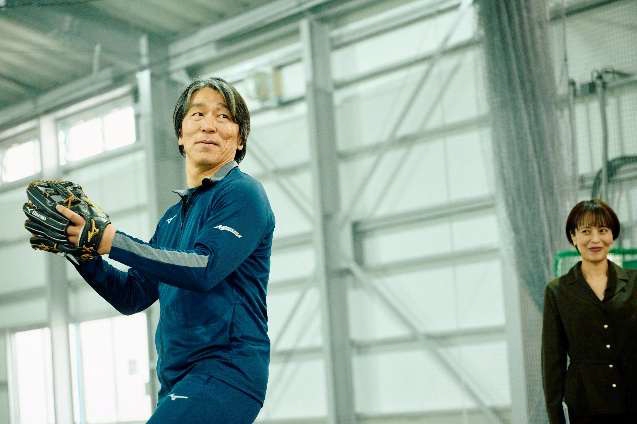 投球では、ラプソードPRO2.0で自らの投球スピードを測定。「ちょうど100キロを目指して投げます」と話す松井秀喜氏、果たして結果やいかに?